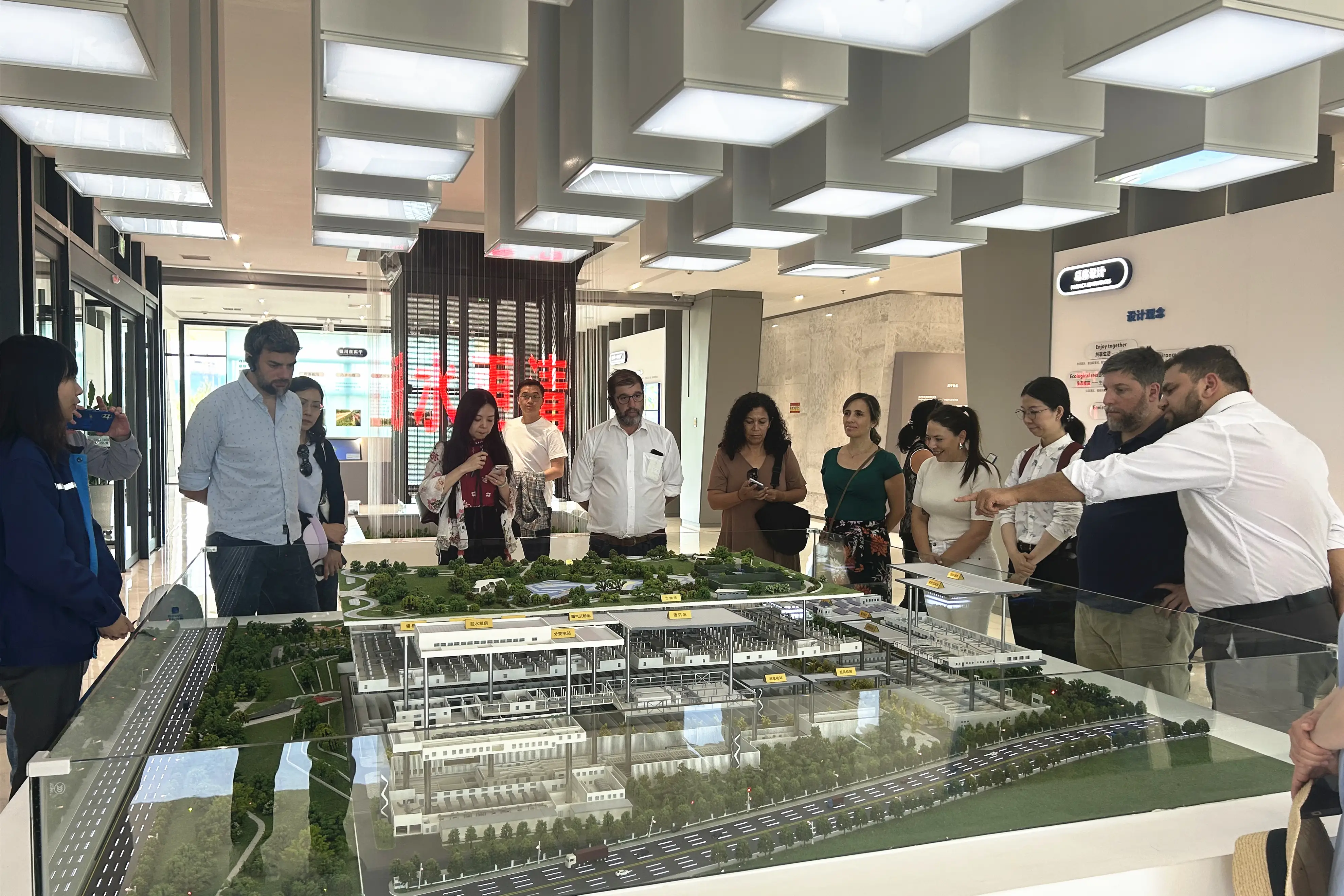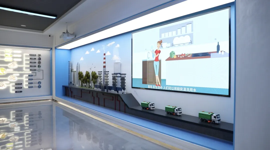 隨后,研學(xué)團(tuán)穿梭在一面面科普展示墻之間,結(jié)合立體模型與動態(tài)畫面,學(xué)習(xí)了污水治理流程、污水和污泥的資源再利用方式等知識,了解了禹上生態(tài)公園如何通過“全地下雙層加蓋”建設(shè)形式,在地下以雨污混接改造工程實現(xiàn)污水零直排,地上則建造出了一片城市綠地。