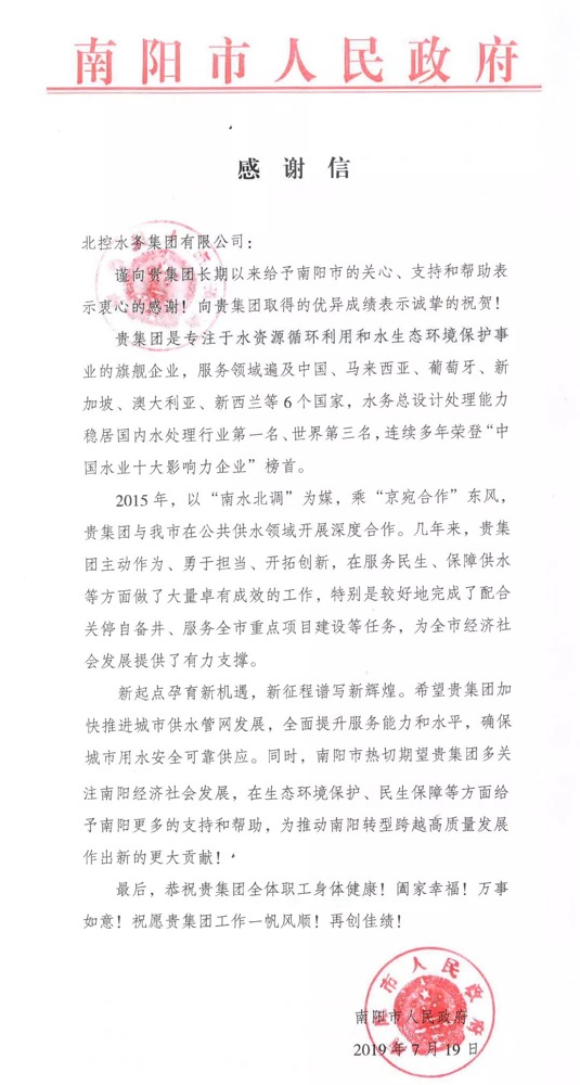 今年7月19日,北控水務(wù)收到了一封來(lái)自南陽(yáng)市人民政府的感謝信。此前,南陽(yáng)市市長(zhǎng)霍好勝到北控水務(wù)旗下的北控南陽(yáng)水務(wù)集團(tuán)進(jìn)行調(diào)研,對(duì)北控水務(wù)專注、專業(yè)、領(lǐng)先的水務(wù)環(huán)境綜合服務(wù)能力給予了高度認(rèn)可。