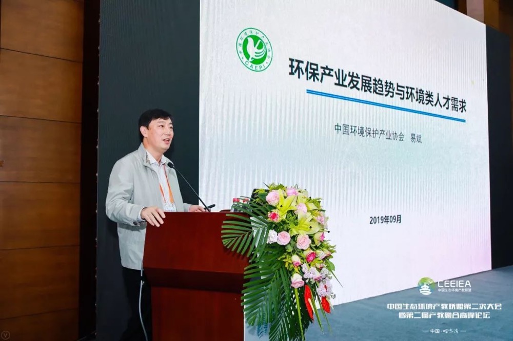 第二屆產教融合高峰論壇,由聯盟副理事長、哈爾濱工業大學環境學院副院長南軍教授主持。中國環境保護產業協會副會長兼秘書長易斌發表特邀報告《環保產業發展趨勢與人才需求展望》。結合當前環保行業發展情況,易斌指出,協同創新是環境技術的發展趨勢,環保人才培養也應注重產研學用協同創新機制,聚焦創新做強環保產業。
