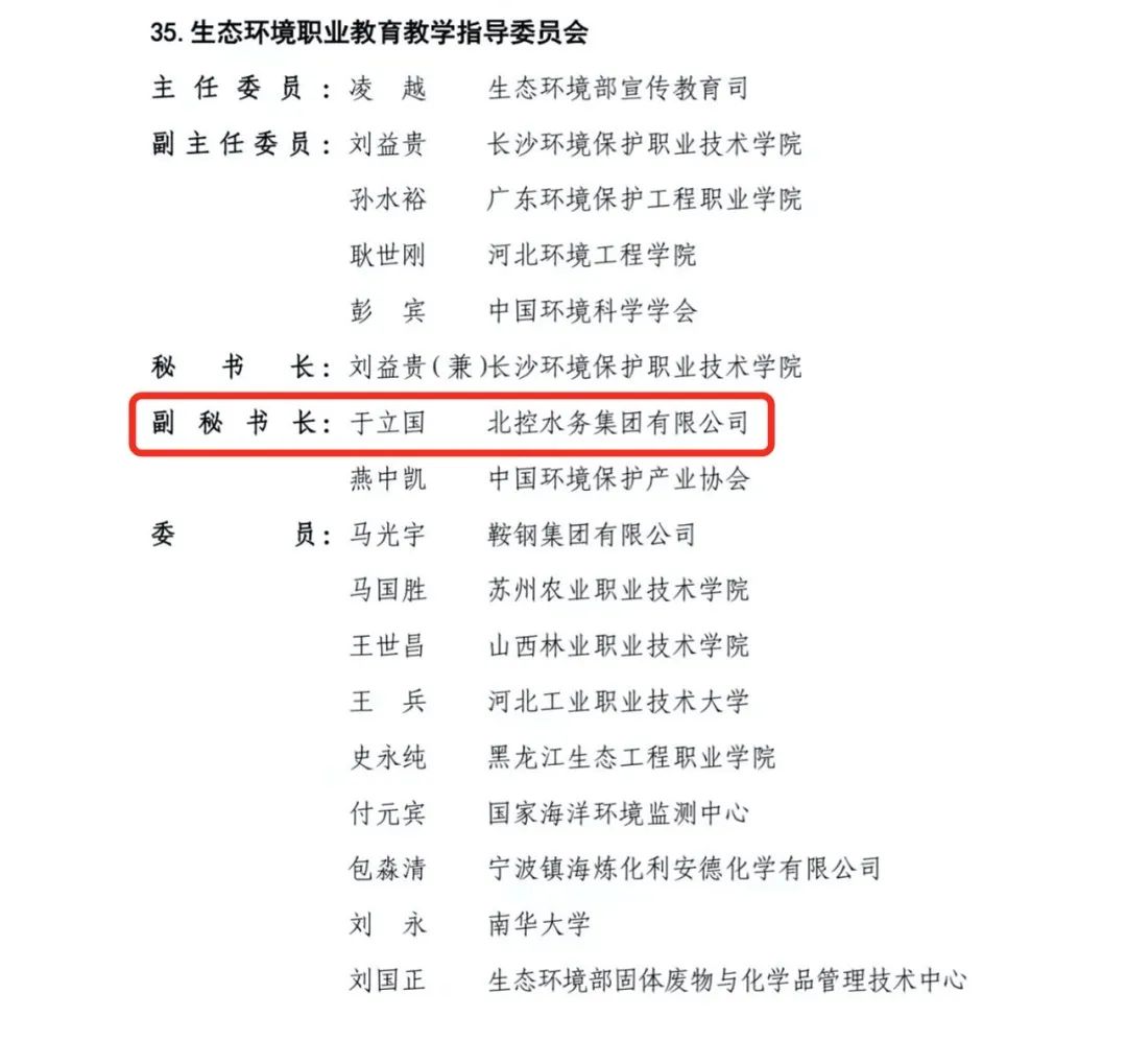 12月13日,教育部公布了新一屆全國行業(yè)職業(yè)教育教學(xué)指導(dǎo)委員會(2021-2025年)組成人員名單,北控水務(wù)輪值執(zhí)行總裁、北控水務(wù)現(xiàn)代產(chǎn)業(yè)學(xué)院院長于立國當(dāng)選全國生態(tài)環(huán)境職業(yè)教育教學(xué)指導(dǎo)委員會副秘書長,北水教育中心副總經(jīng)理、北控水務(wù)現(xiàn)代產(chǎn)業(yè)學(xué)院副院長冀廣鵬當(dāng)選全國人力資源和社會保障職業(yè)教育教學(xué)指導(dǎo)委員會委員。