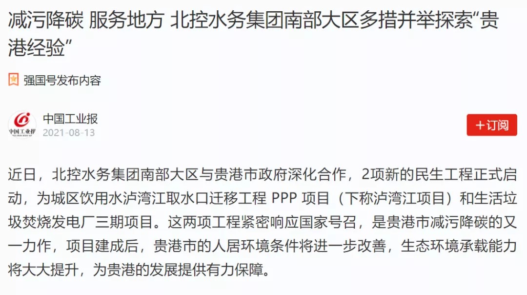 學習強國 | 減污降碳 服務地方 北控水務集團南部大區多措并舉探索“貴港經驗” 2021-08-13